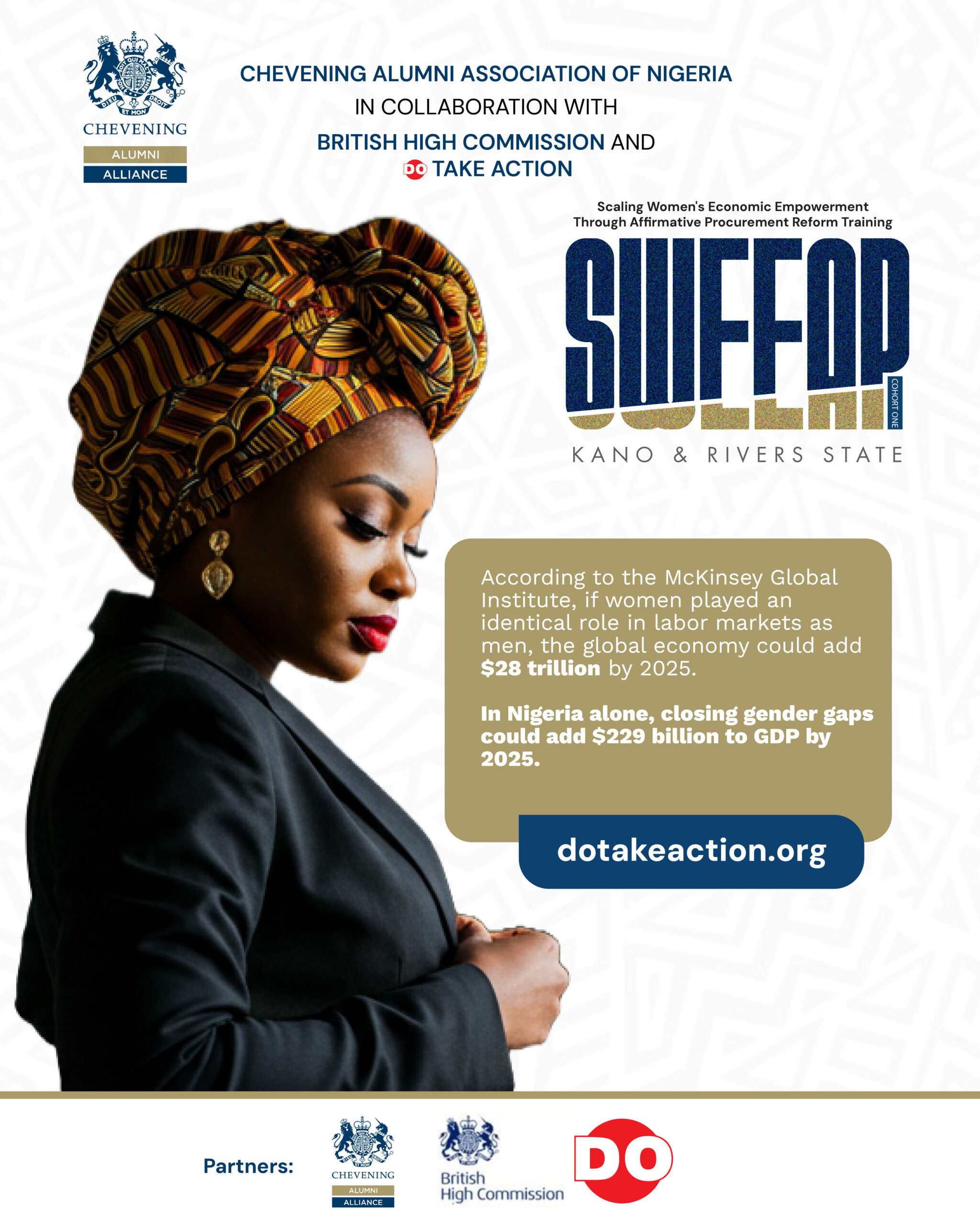 The Scaling Women's Economic Empowerment through Affirmative Procurement Reform (SWEEAP) Training Programme is implemented by DO Take Action in collaboration with the Chevening Alumni Association of Nigeria, with support from the UK Foreign, Commonwealth & Development Office (FCDO) through the Chevening Alumni Programme Fund (CAPF).